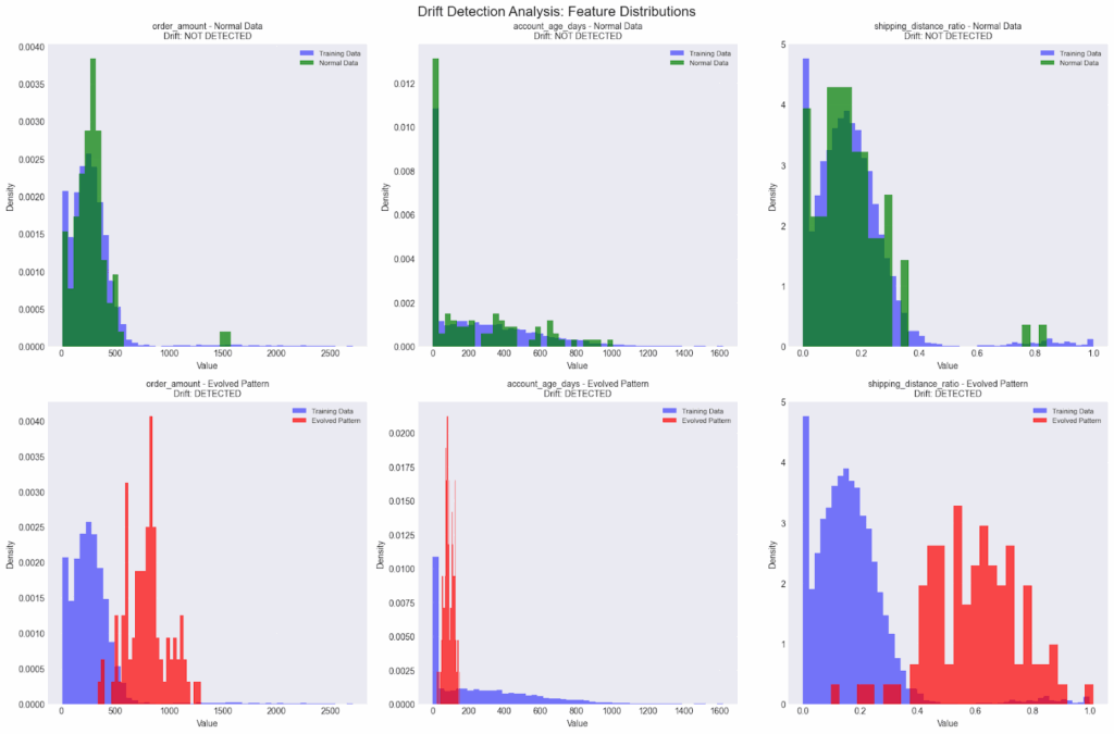 (2) an evolved fraud pattern, where distributions shift significantly (drift detected).